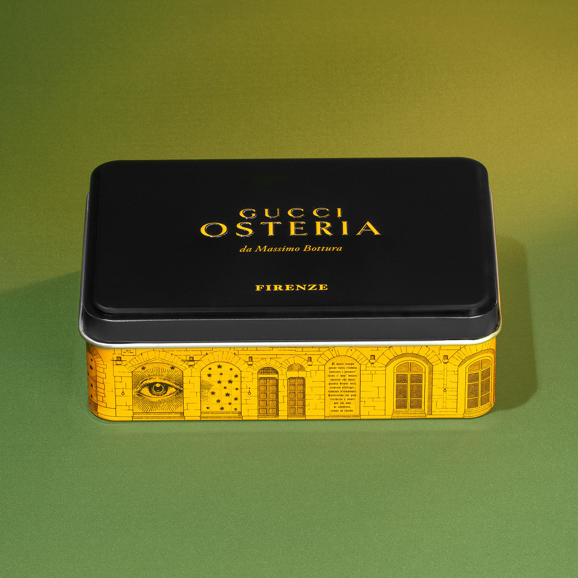 Un viaggio al gusto di caramello, racchiuso in un’elegante scatola di latta che raffigura lo storico Tribunale della Mercanzia, palazzo risalente al 1359 e simbolo di Firenze, oggi casa del Gucci Garden e di Gucci Osteria. Scopri dei biscotti capaci di creare momenti indimenticabili con sapori familiari che portano a nuove scoperte.